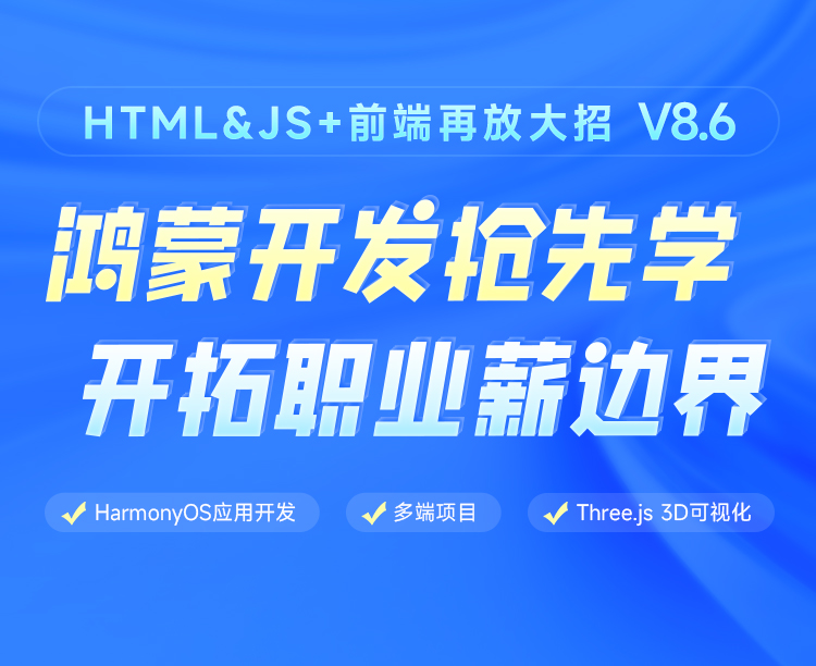 1. 移动Web 2. JavaScript 3. 数据可视化看板项目 4. Vue.js 5. Vue2项目 6. Vue2进阶项目 7. 神领物流平台 8. 小程序&多端开发 9. 原生小程序项目 10. uni-app小程序项目 11. 鸿蒙应用开发 12. 鸿蒙应用开发项目 13. React.js 14. 极客园PC自媒体端